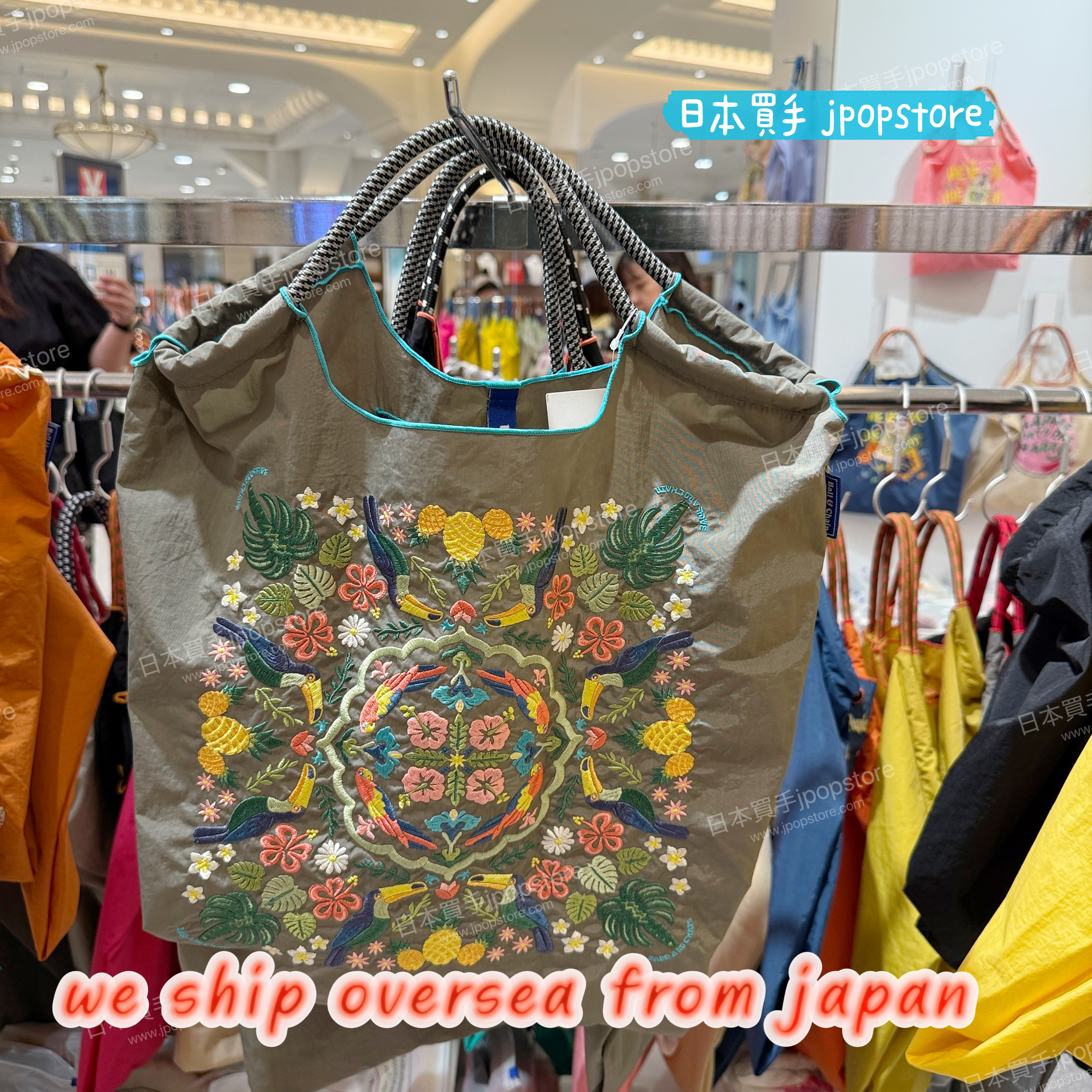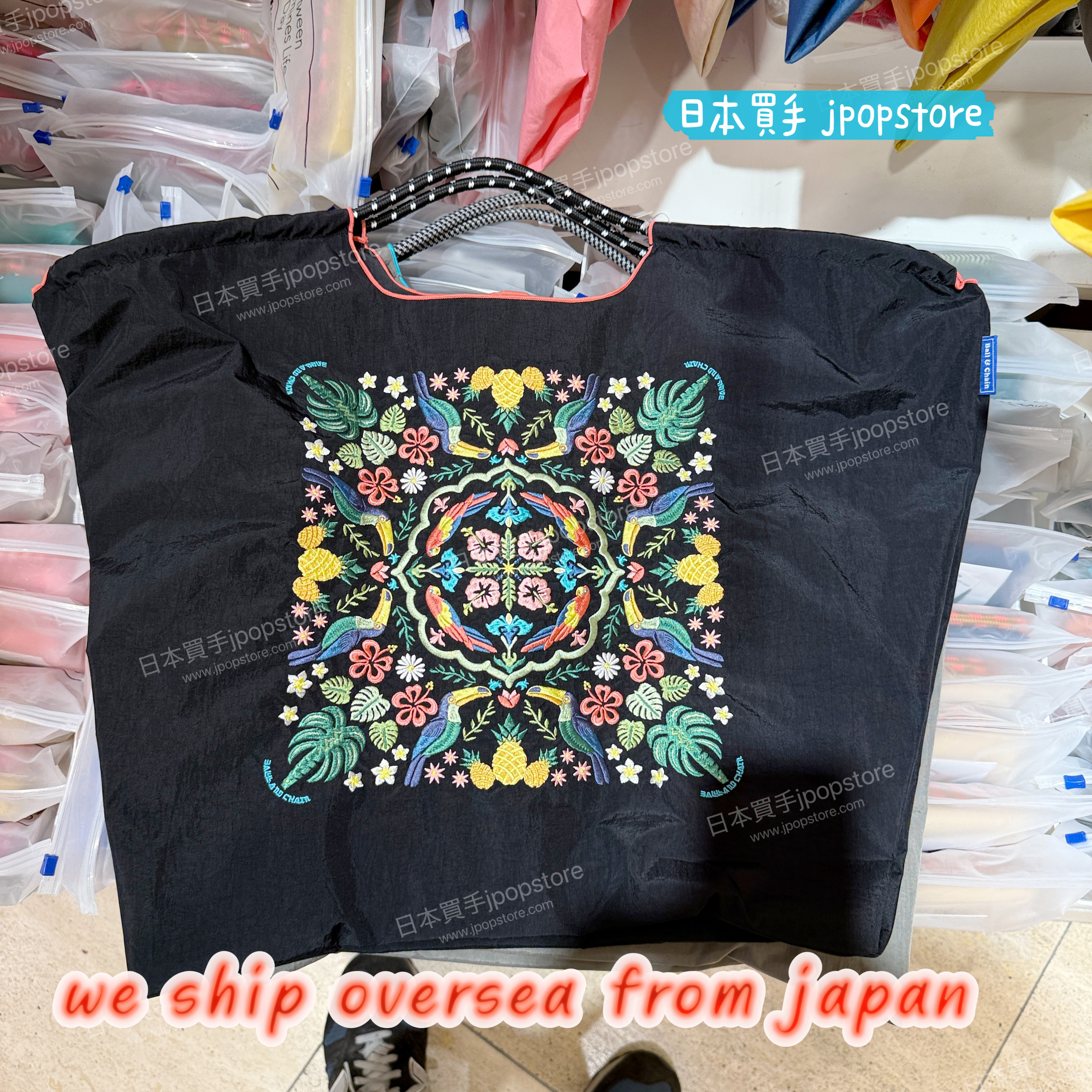 熱帶風情滿載的 Ball & Chain 刺繡環保袋,展現夏日氛圍,耐用尼龍材質,M/L 尺寸可選。 / Tropical-inspired Ball & Chain embroidered eco bag in durable nylon, available in M/L sizes.