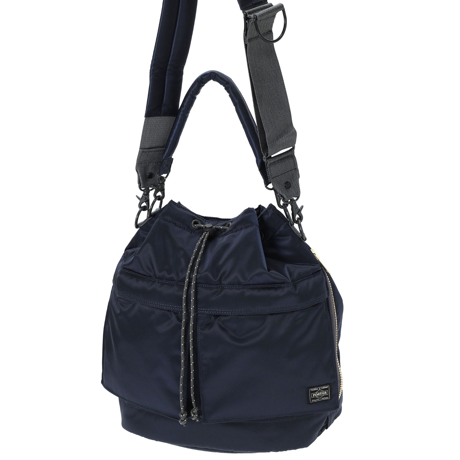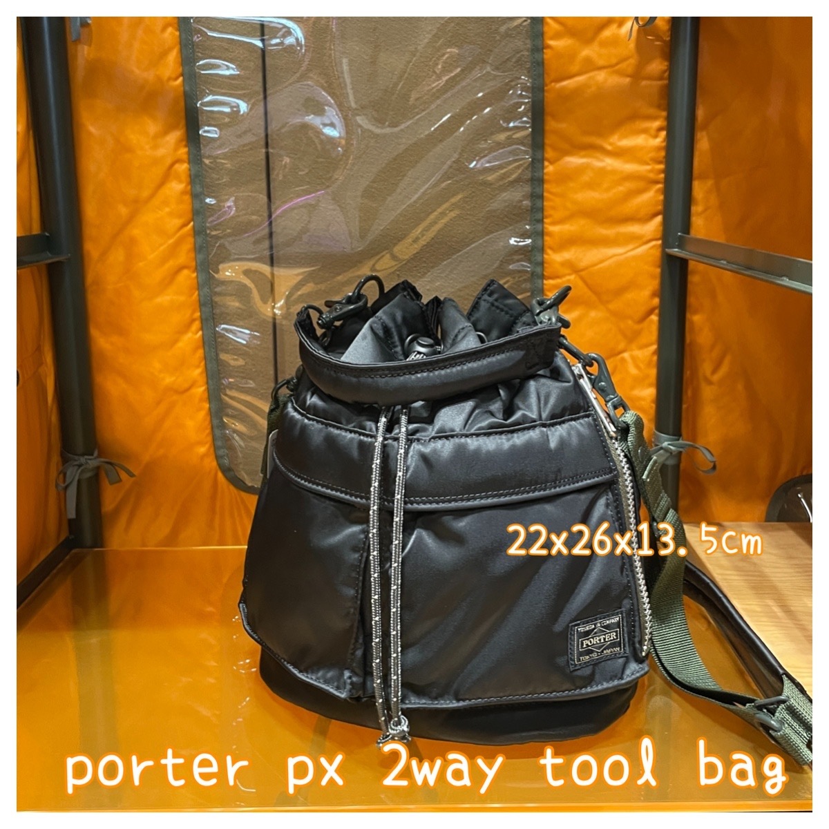 結合MA-1軍風與高機能細節的2WAY抽繩工具包,附專利可調式肩帶,日本製。