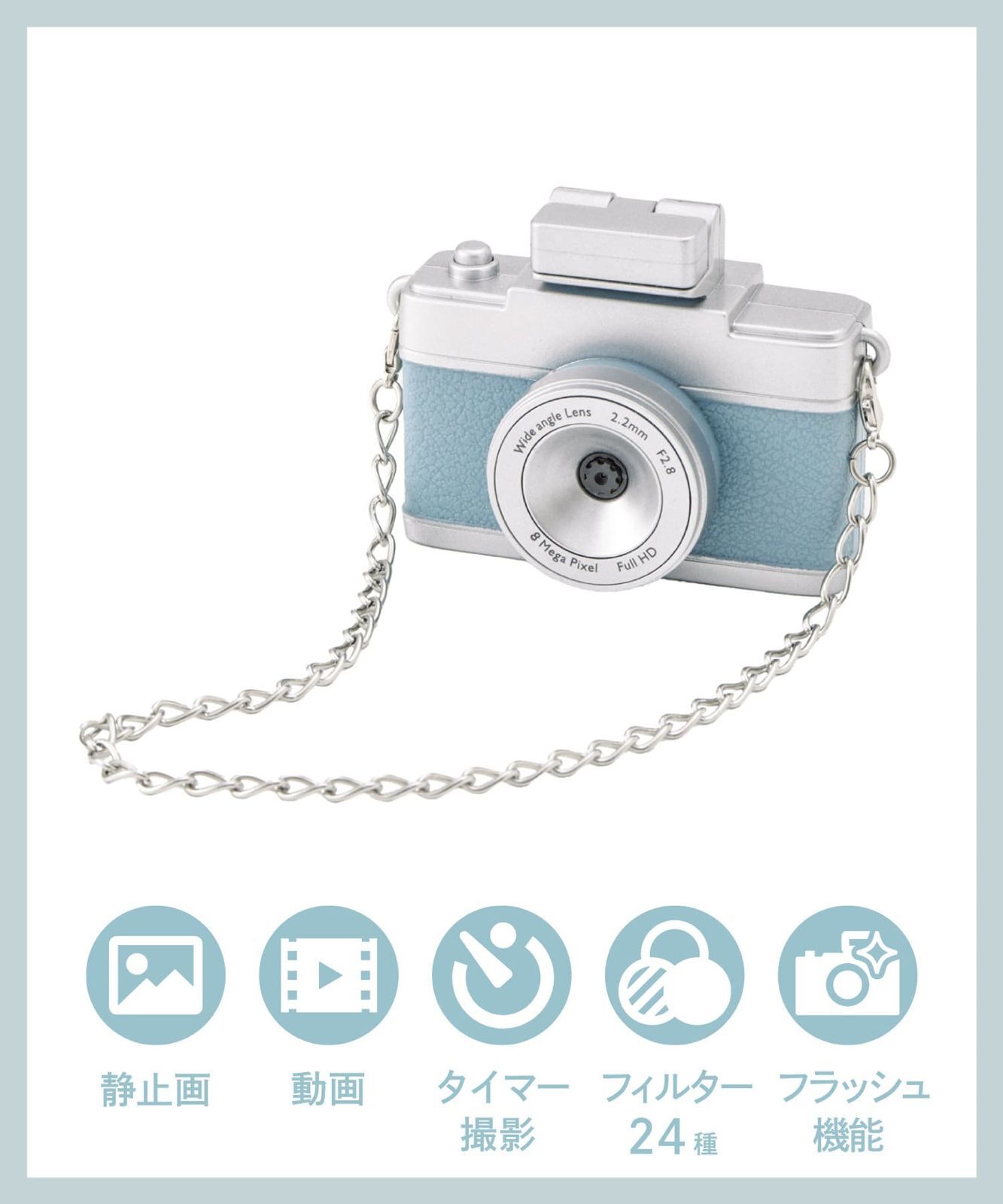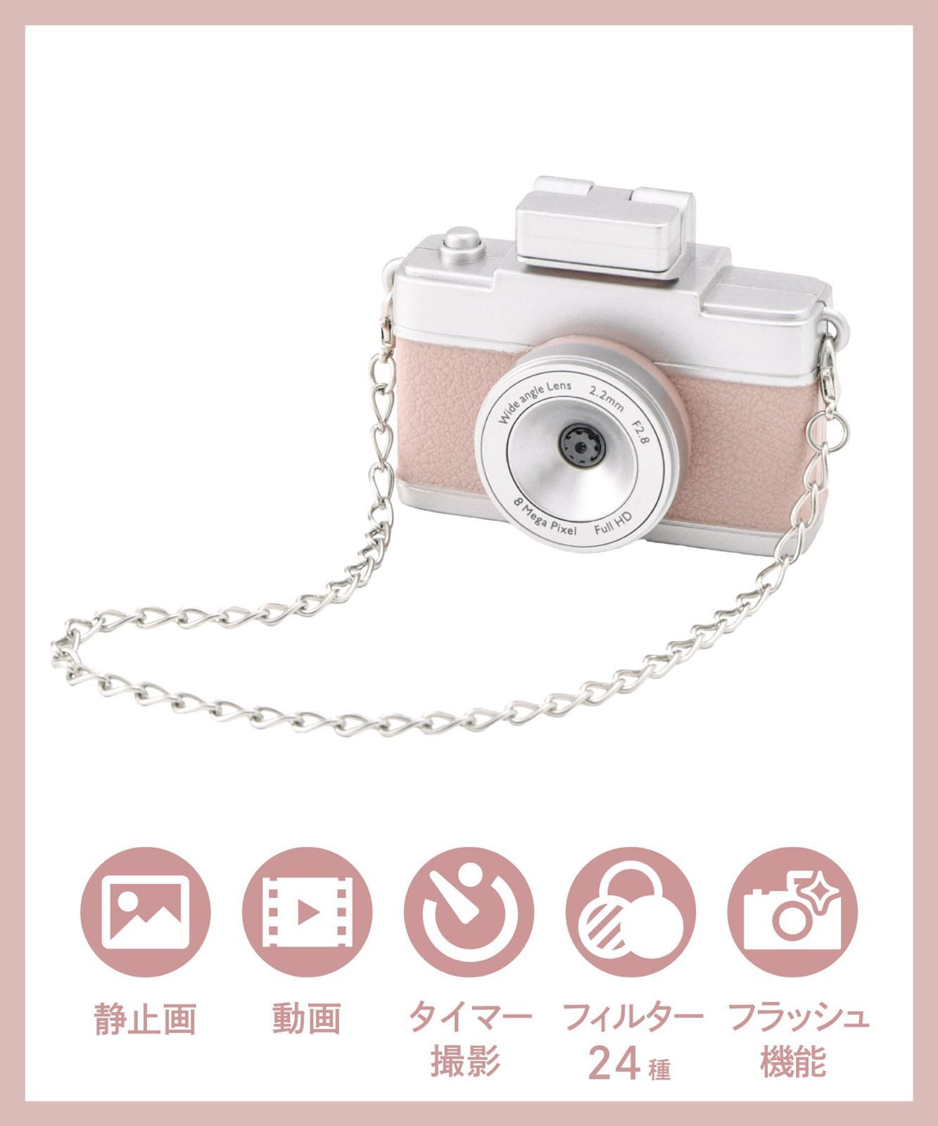 迷你液晶螢幕玩具相機,支援拍照錄影、定時拍攝、濾鏡特效、閃光燈及SD卡擴充。
