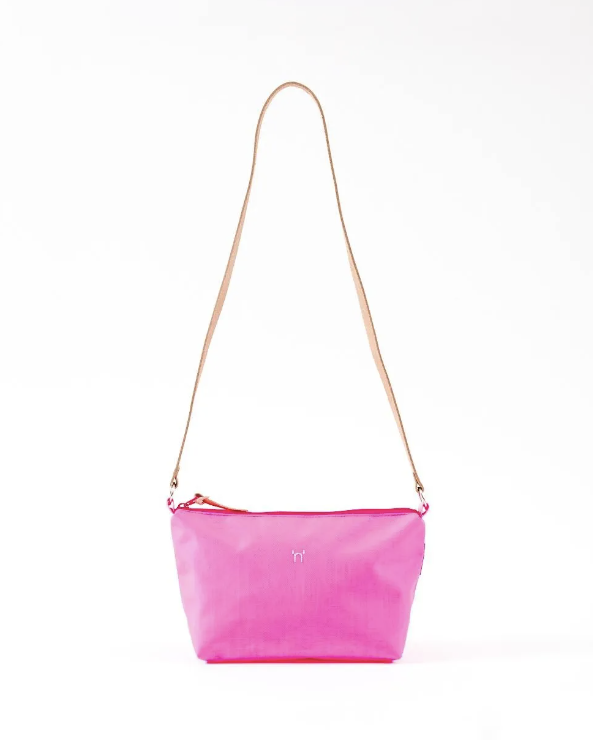 袋身採用具有凹凸質感的 高密度尼龍材質,具備工業用途等級的堅韌與色彩飽和度。正面繡有經典 “n” LOGO,配上 真皮手挽細節,簡約中帶有質感。