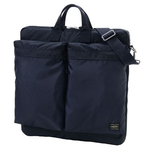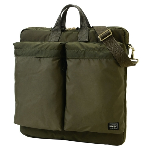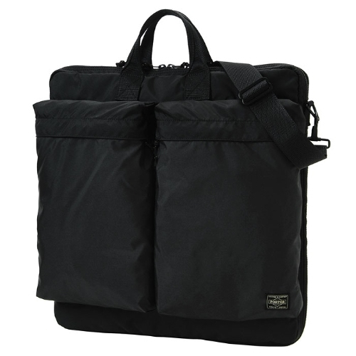 這款 2WAY HELMET BAG 來自 PORTER 的「FORCE」系列,設計靈感源自軍用品中常見的布料色差與隨機質感。布料以 210旦 6尼龍高強度線編織而成,染色後呈現獨特光澤與條紋,展現出強烈的軍事風格。