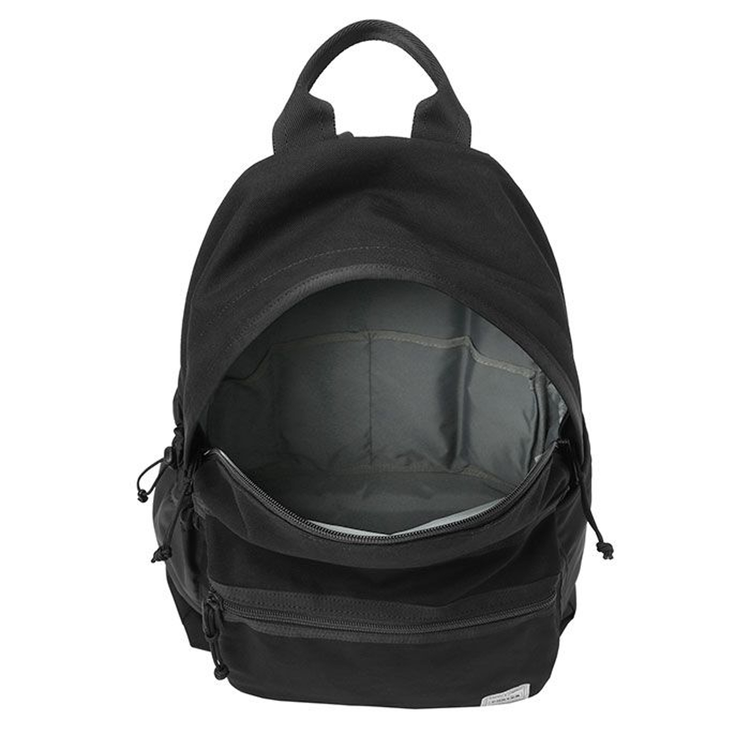 Casual daypack featuring cotton serge with water-repellent finish, reinforced GAIFU base, and ripstop nylon accents. Lightweight, durable, and all-black versatile design.