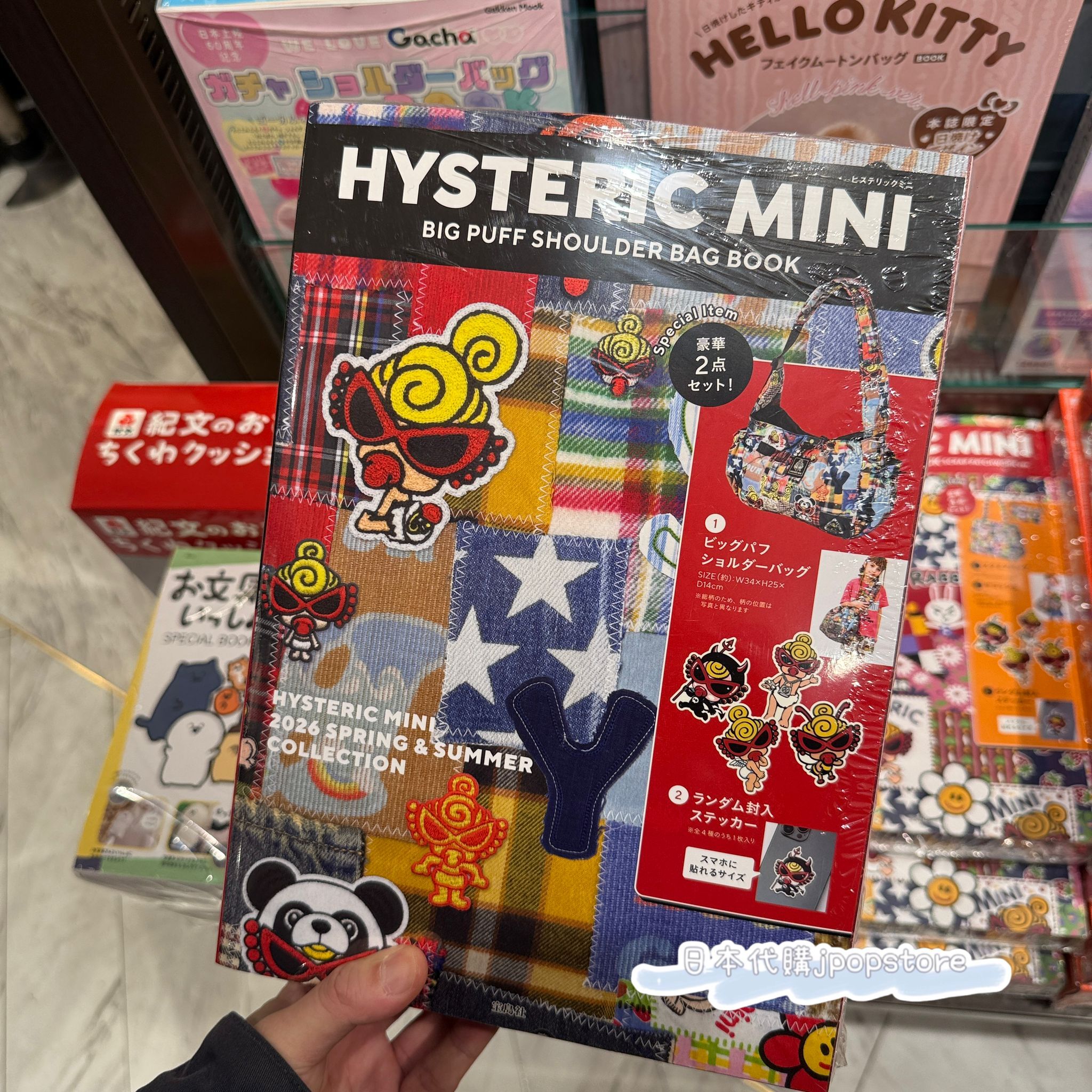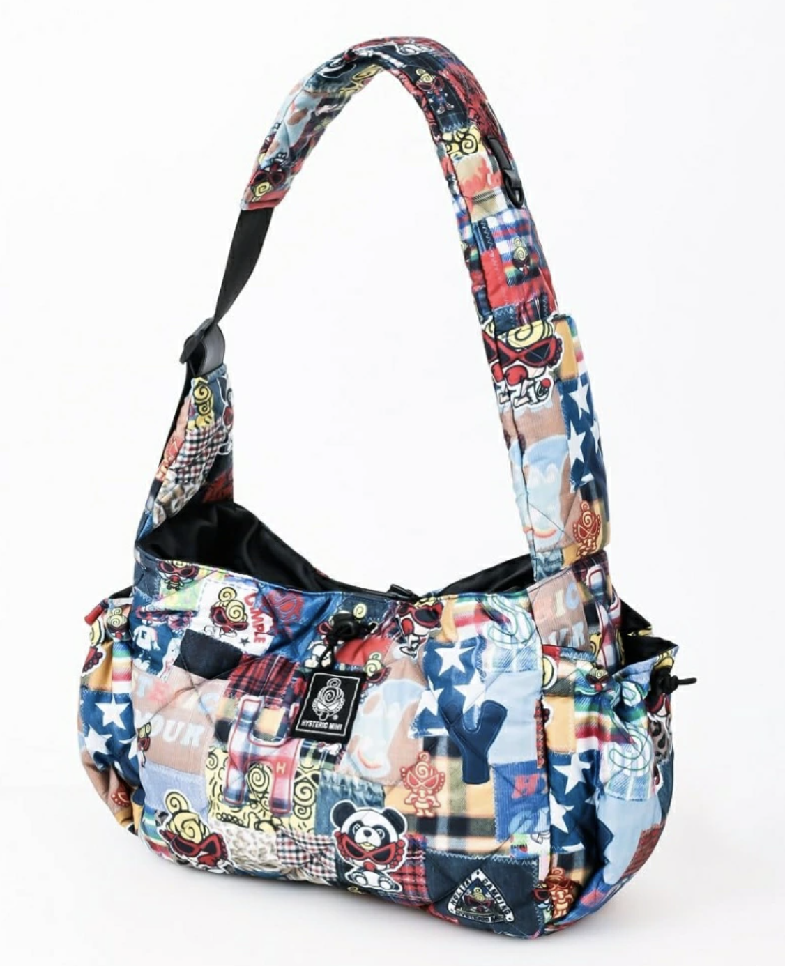 HYSTERIC MINI 最新品牌限定款,輕盈絎縫設計拼布印花單肩包,附隨機貼紙。