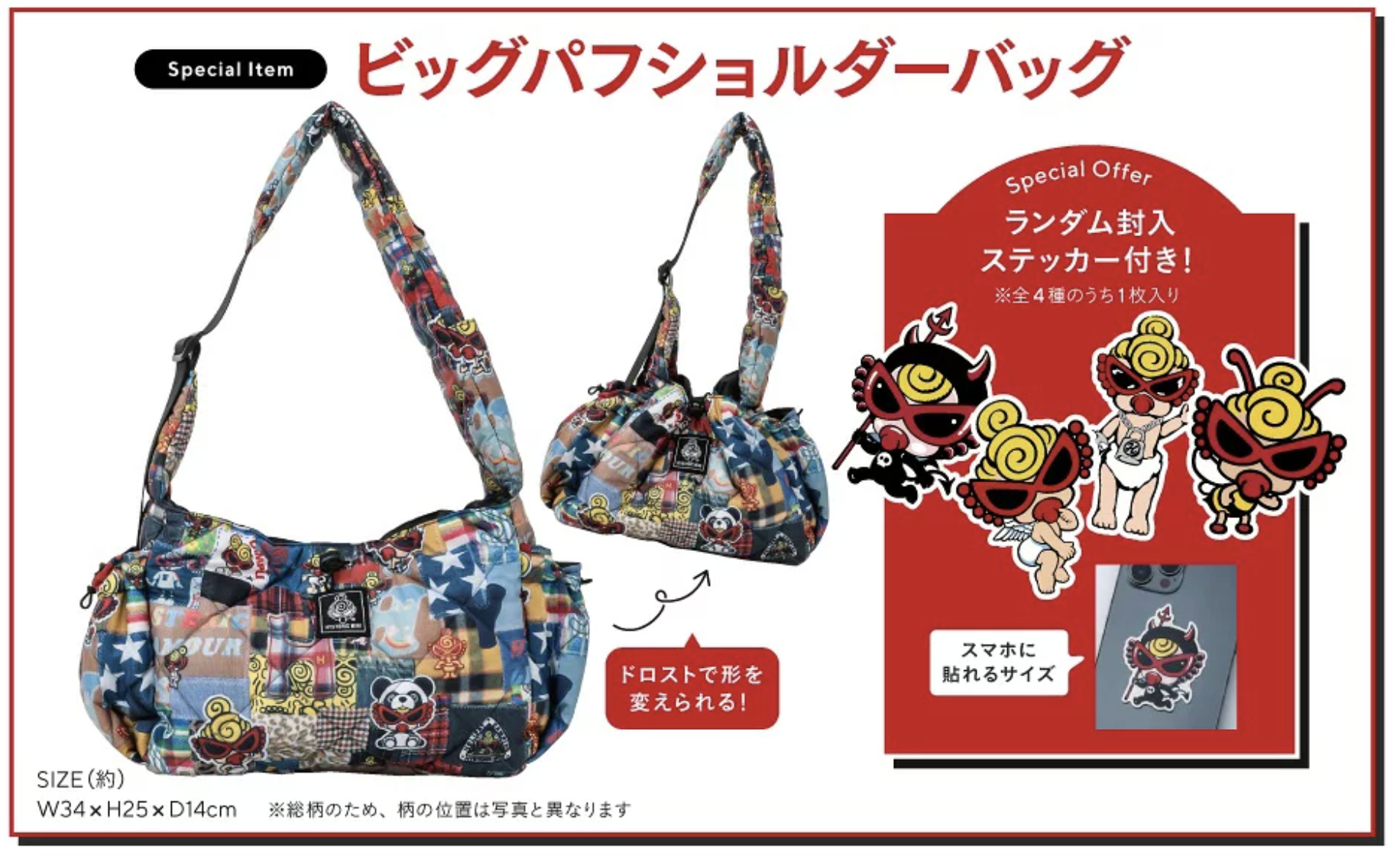 特別附錄為一款採用輕盈蓬鬆絎縫(Quilted)面料製成的MESSY PATCHWORK拼布風印花單肩包。整體以牛仔風拼接圖案呈現,配上品牌經典角色圖案,色彩豐富又充滿玩味感。