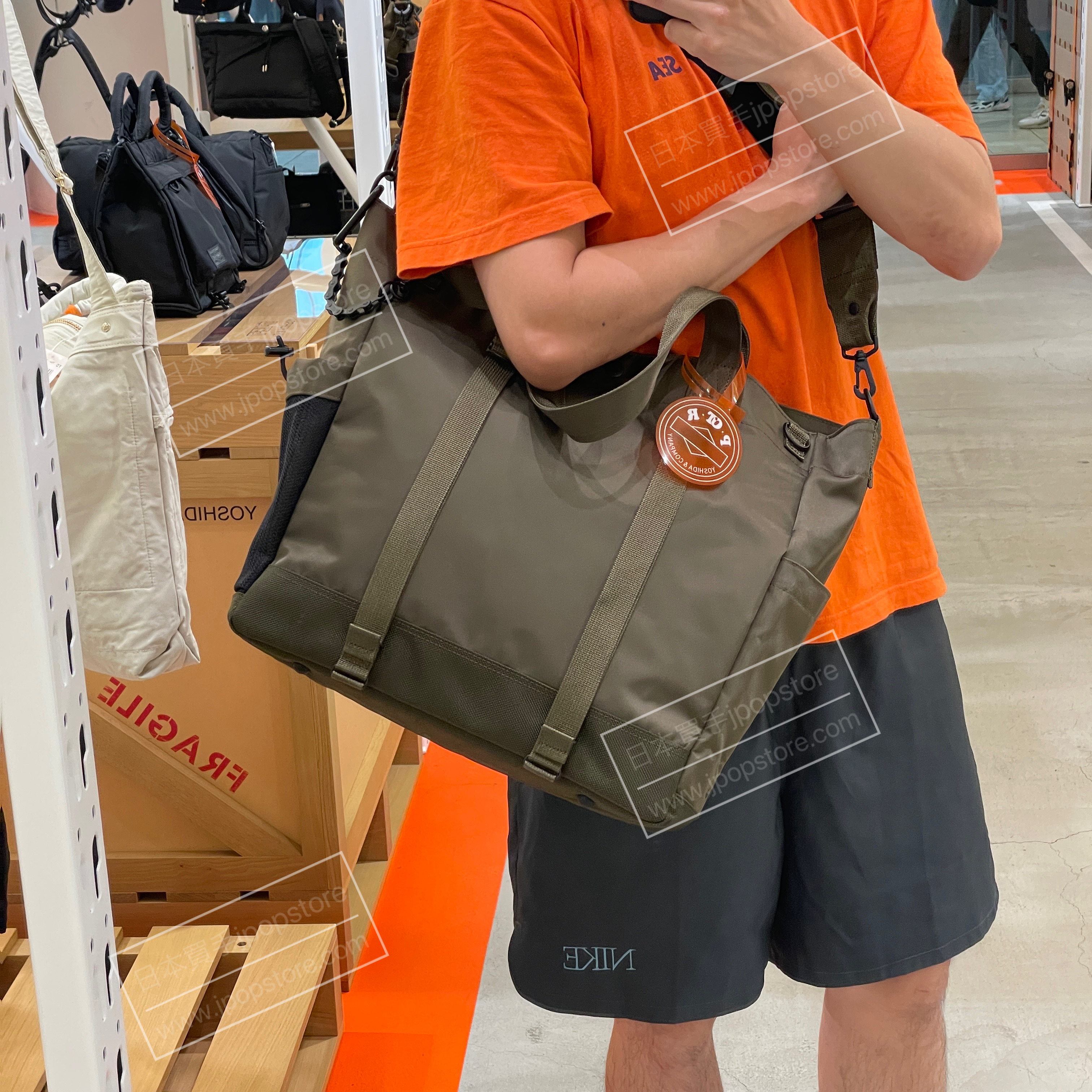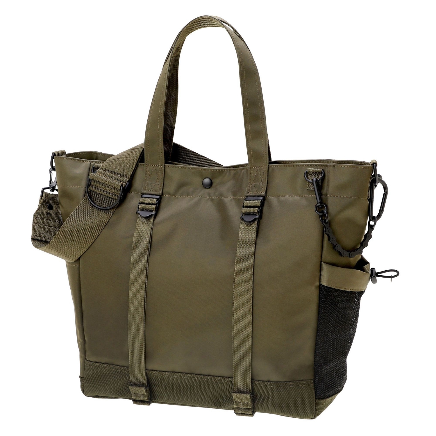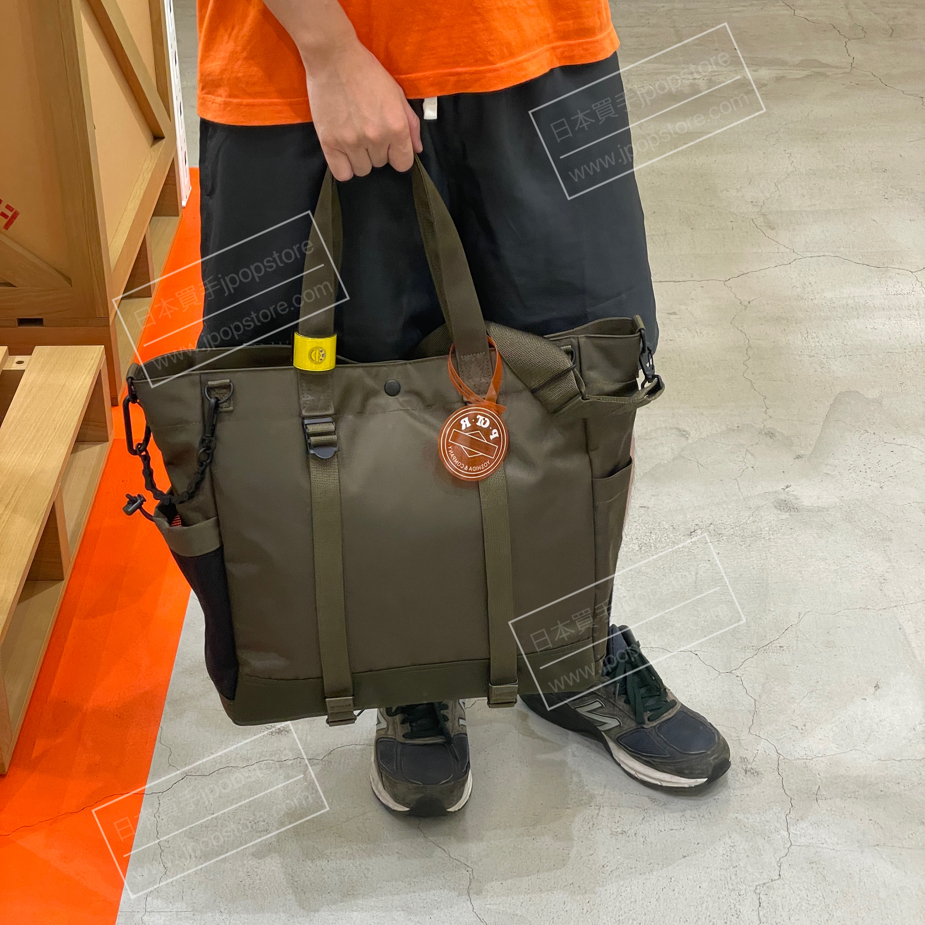 這款 L 號 2WAY 手提袋設有舒適肩背手挽和可拆式斜背帶,可自由轉換攜帶方式。內部附有加厚防震 PC 隔層,可收納至多 14 吋筆電。兩側外袋能放置水樽或雨傘,並附有反光安全帶與日本製競技用鏈條裝飾,兼具設計與功能性。