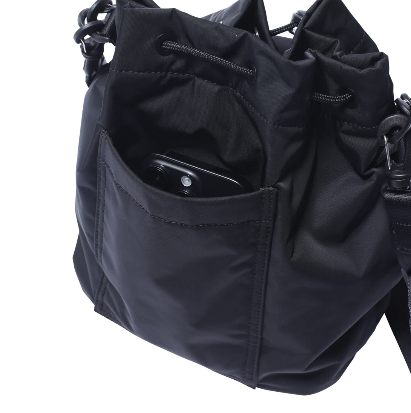 The RAMIDUS BLACK BEAUTY drawstring shoulder bag features a minimalist all-black design with premium materials. Inspired by a classic drawstring pouch, it offers versatile carrying options including hand carry, shoulder, and crossbody.