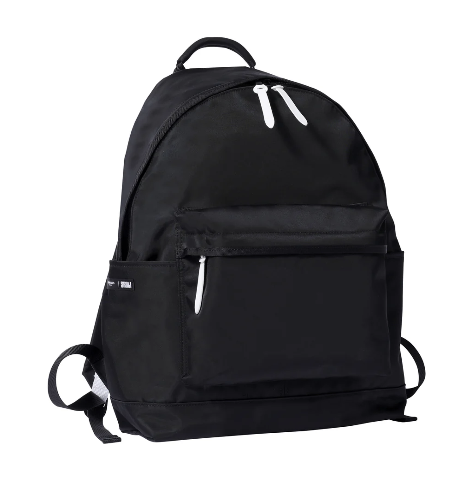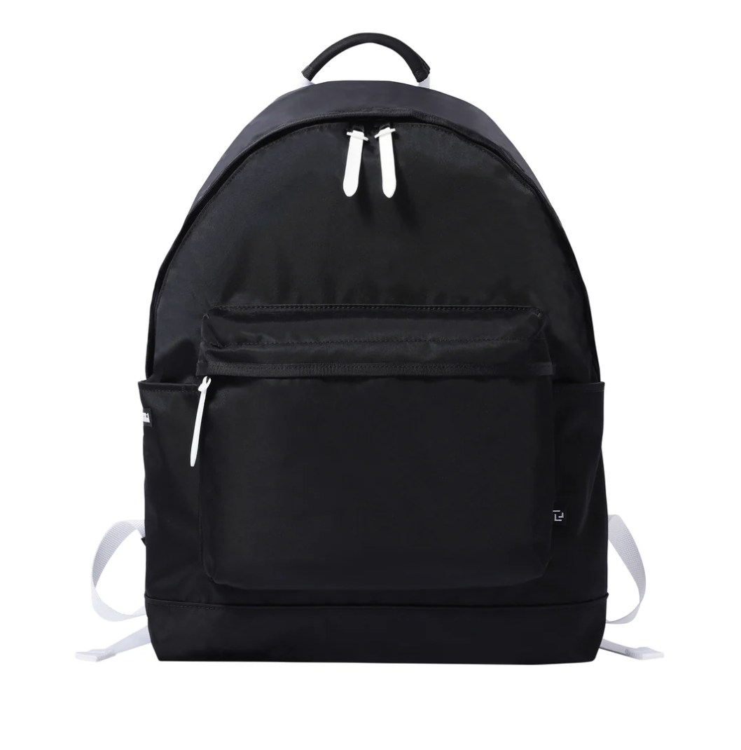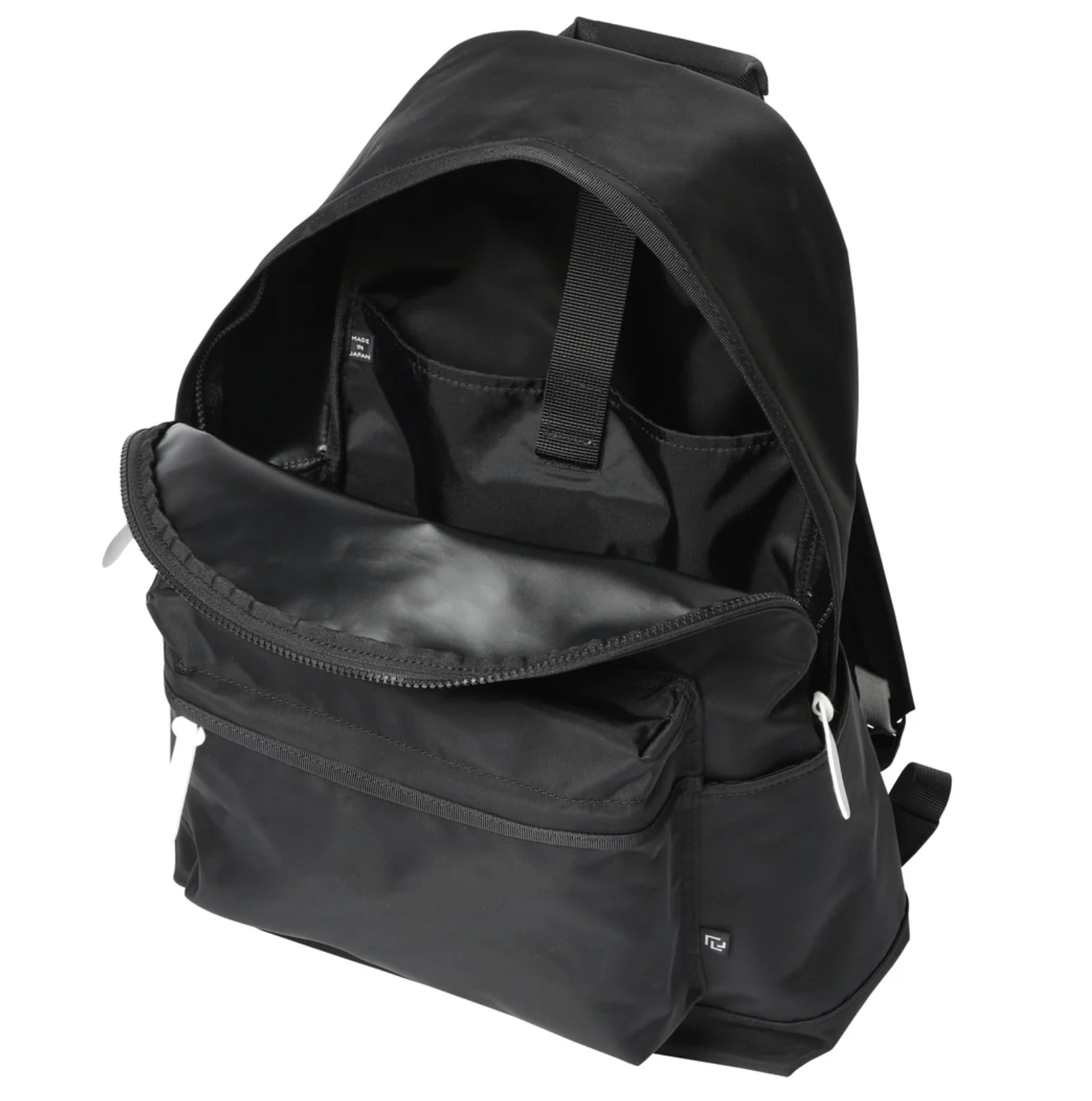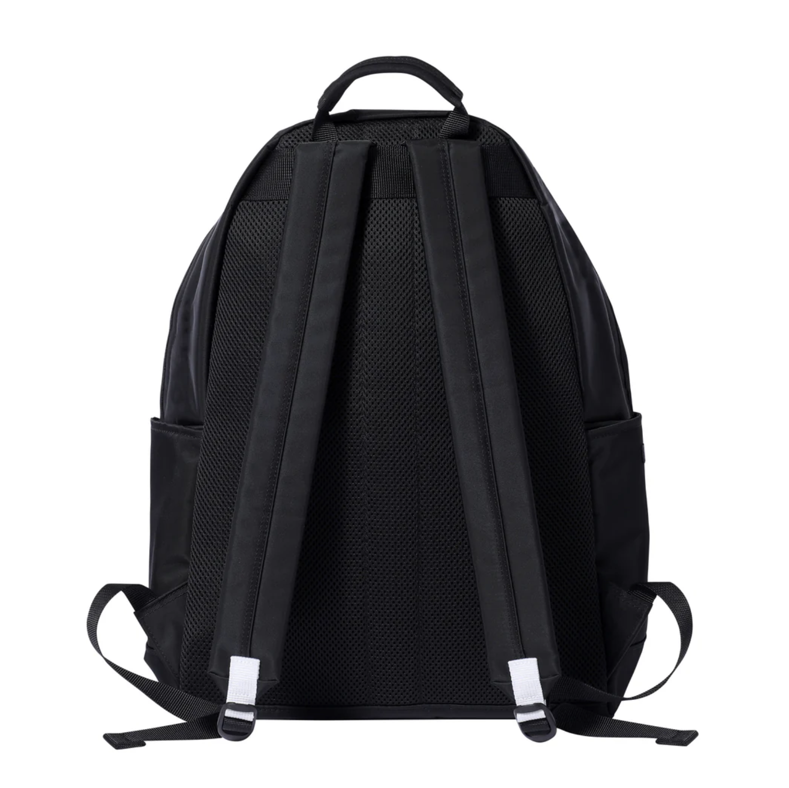SHATI 系列以滑順有光澤的尼龍質感為特色,這款黑色雙肩背囊採用大開口設計,便於收納與取物。內部附有可放入 16 吋 MacBook Pro 的筆電隔層,外側則有寬大前袋與兩側水瓶口袋。簡潔的黑白撞色搭配,展現低調又現代的城市風格。