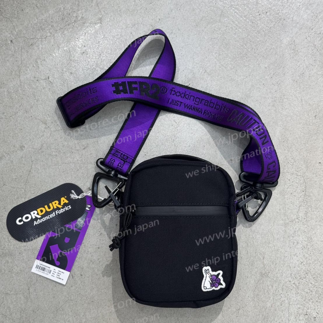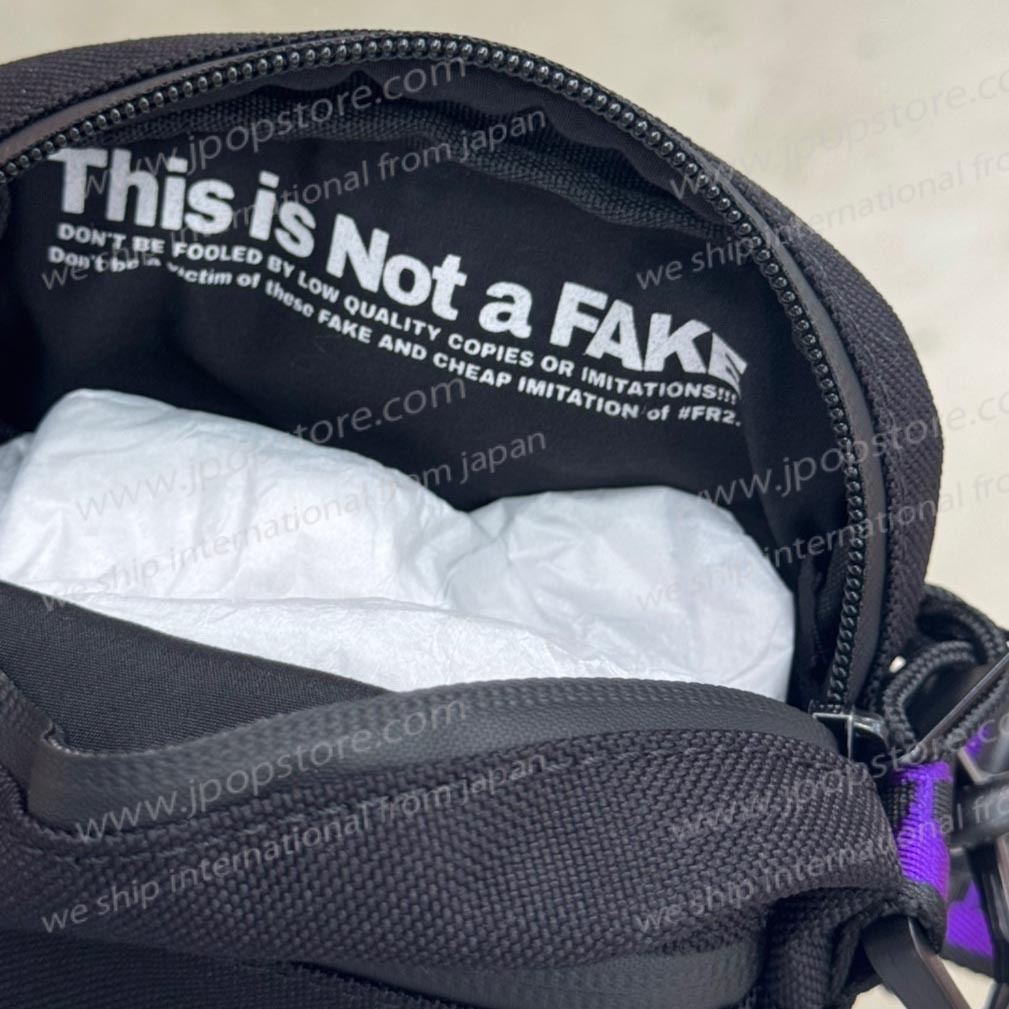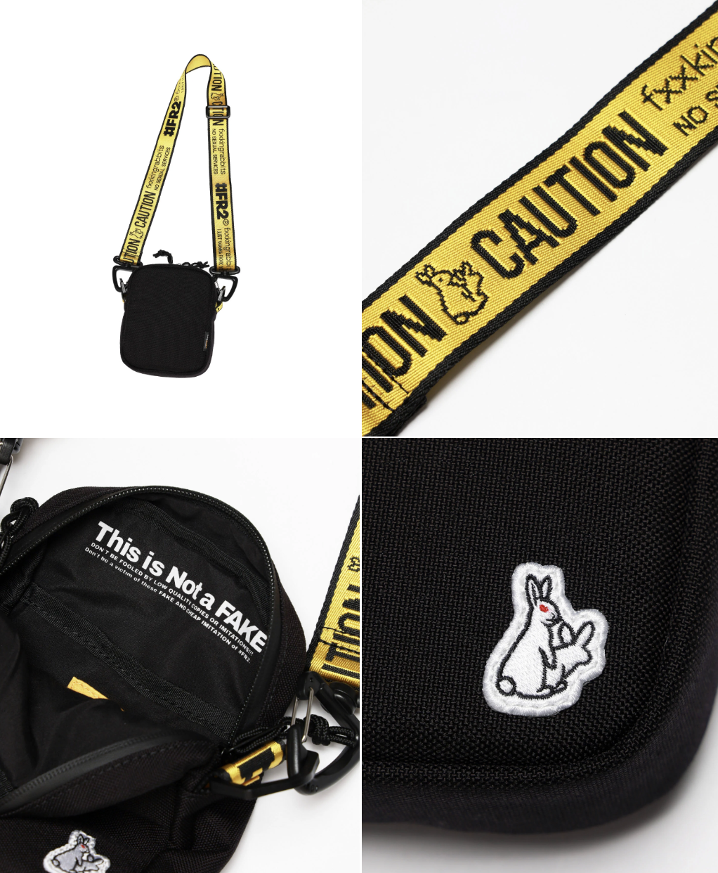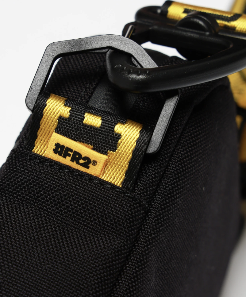 FR2 推出的這款斜背小袋,以品牌經典標語「CAUTION」及「#FR2」點綴黃色肩帶,成為造型中的亮眼配件。