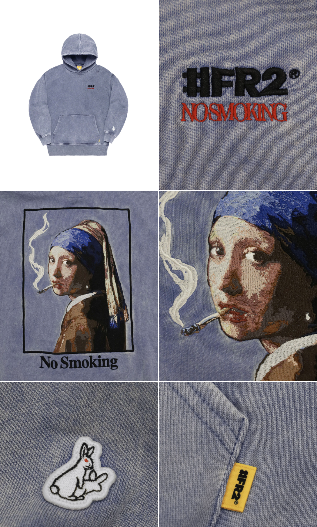 仿舊 Acid Wash 風加工,背面以刺繡呈現畫作風女性圖像,正面簡潔 FR2 Logo,厚實保暖、穿感舒適。