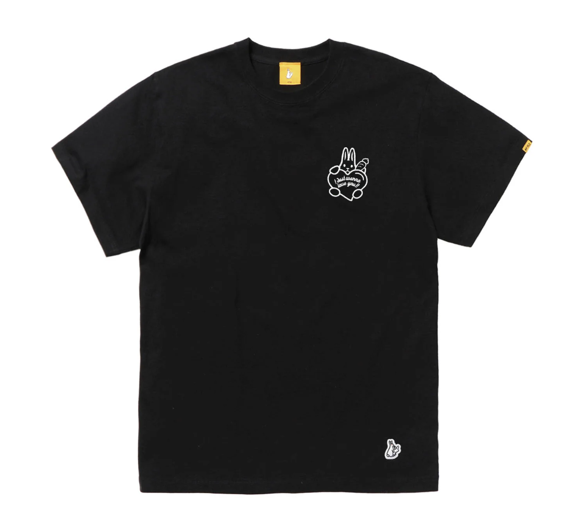 背面以 POP 風格呈現兔子抱愛心圖像,搭配標誌性訊息字樣設計,視覺效果搶眼吸睛。圖案細節包含紅心與胡蘿蔔元素,玩味感十足,展現 FR2 一貫幽默街頭風格。