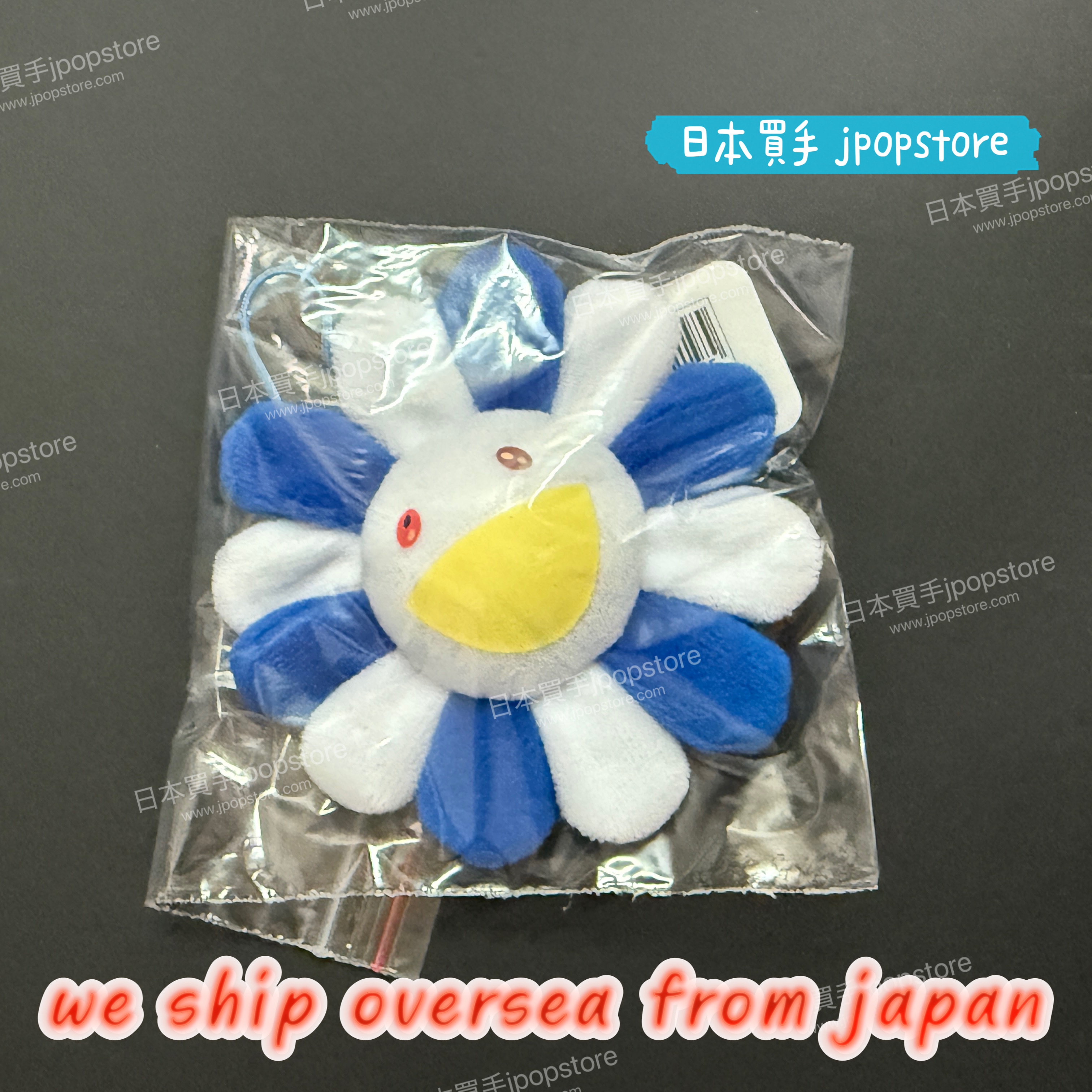 村上隆經典花花系列,藍白配色版本。8cm 尺寸,附扣飾,適合別在背包、外套等日常單品上,展現個人風格。