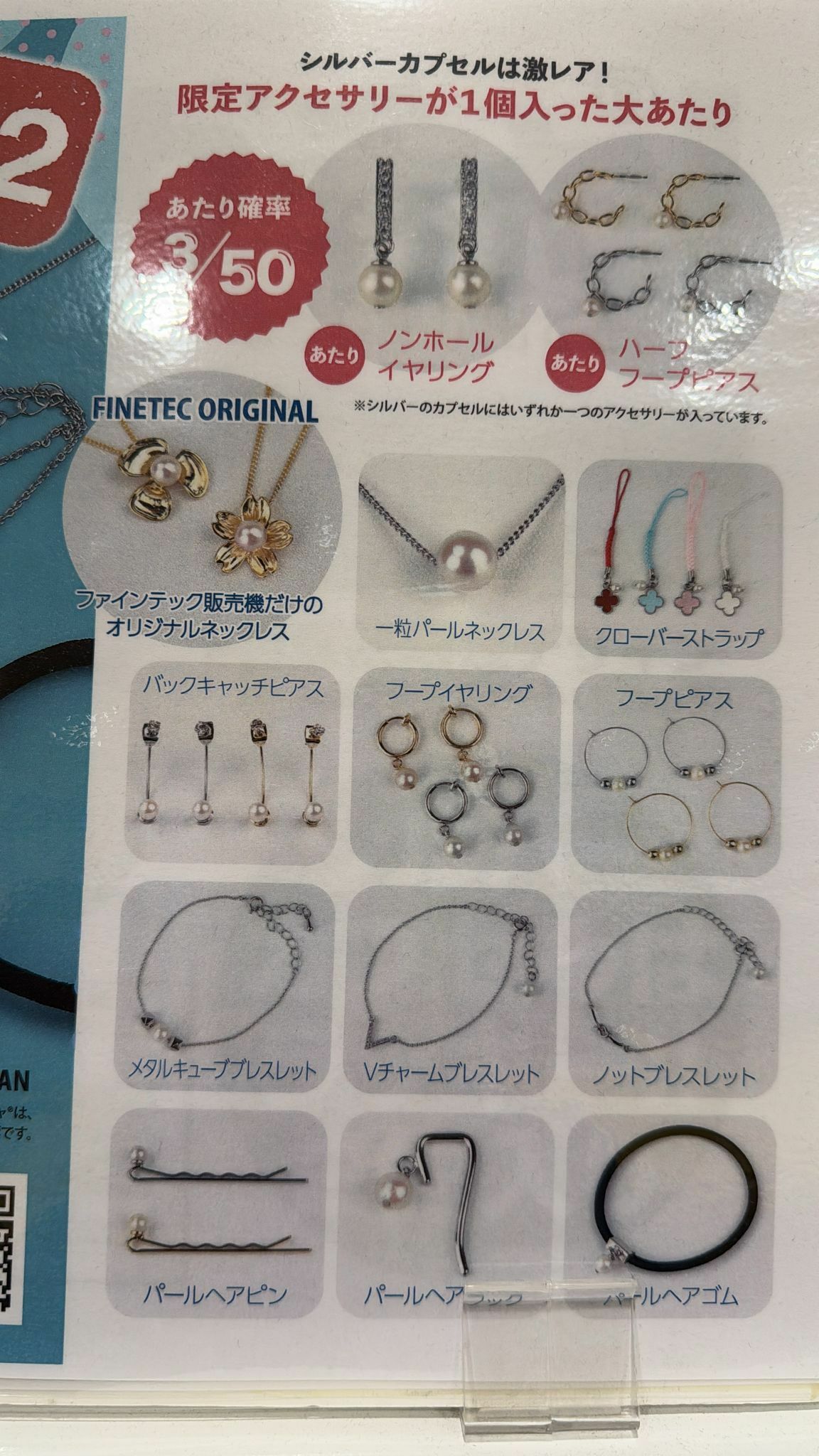 每顆扭蛋內含一件使用天然 Akoya 真珠打造的飾品,包含耳環、手鏈、髮夾、項鍊、鑰匙圈等多種款式,細節精緻、質感滿分。所有款式皆為 MADE IN JAPAN,由知名飾品公司 FINETEC 操刀製作。