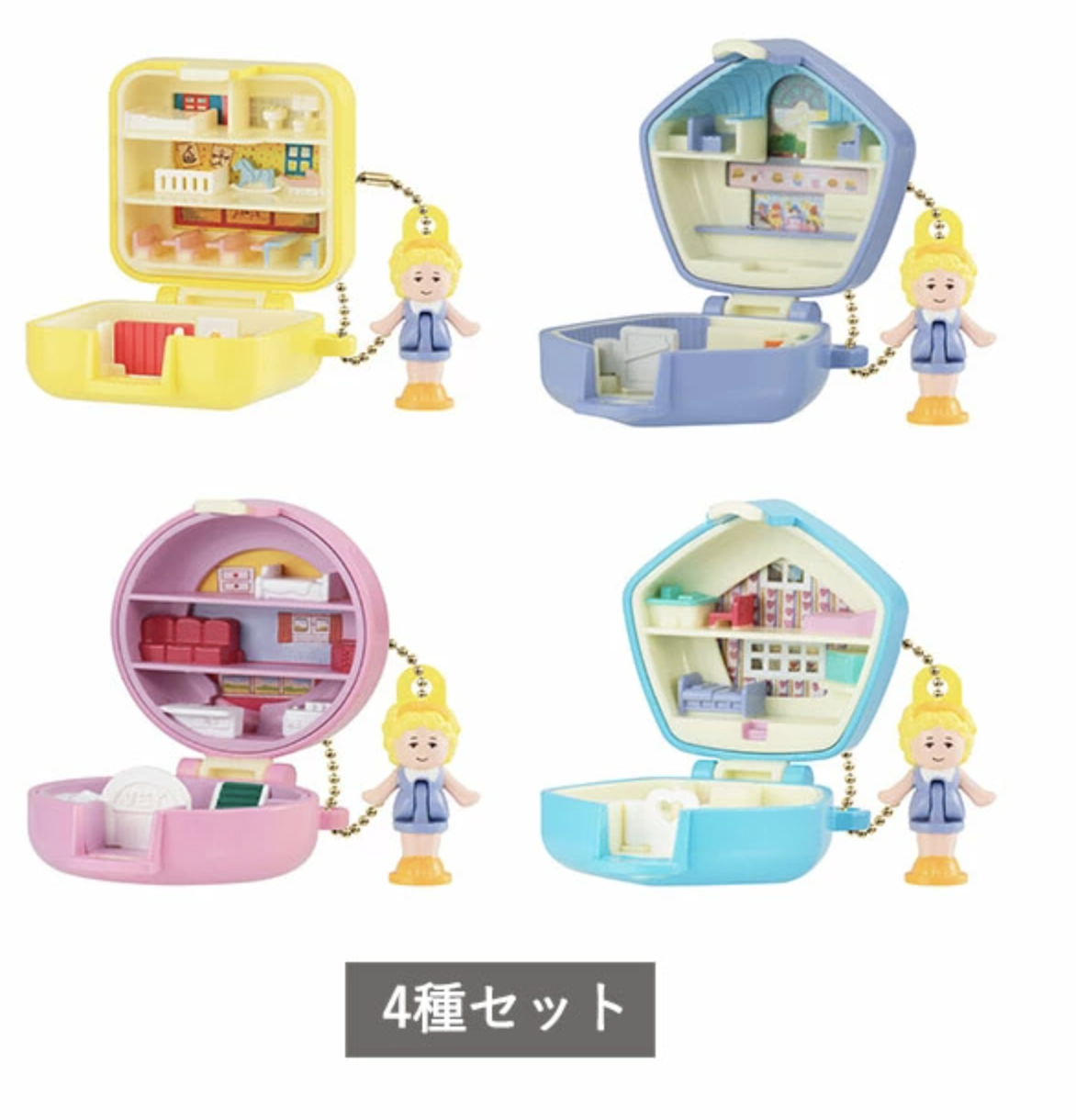 日本扭蛋限定!POLLY POCKET 經典復刻迷你公仔組,一套4個,每款都包含精緻場景盒與可愛人物。盒身設計細節豐富,可開合收藏,附有金屬吊鍊方便掛飾,是懷舊收藏與送禮的完美選擇!
